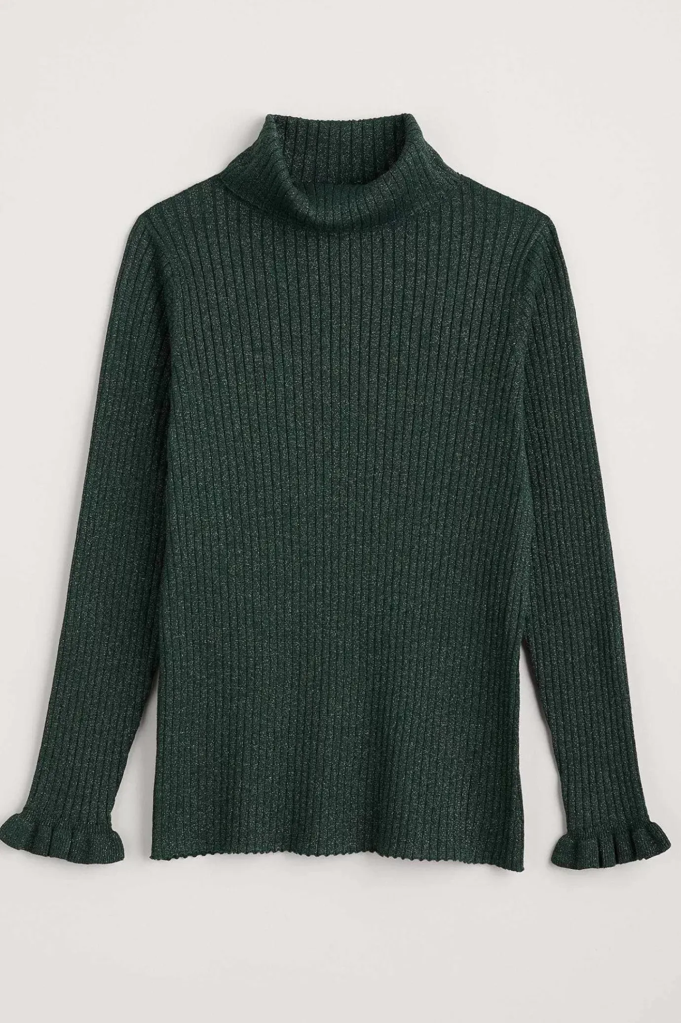 A Fitted Roll Neck Jumper With A Sparkly All-Over Rib Stitch And Playful Frilled Cuffs. We Love It With Jeans For Days In The Office, Or Tucked Into A Skirt To Add Festive Glimmer To Parties And Dinners.
